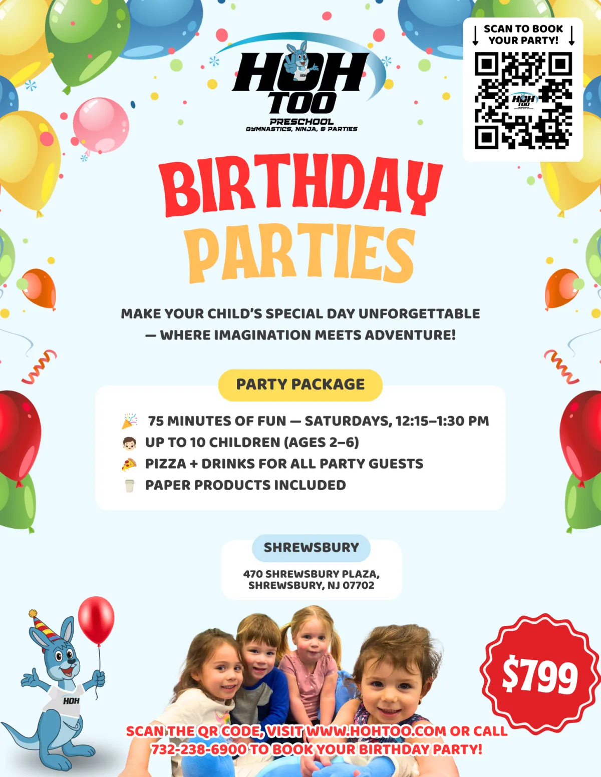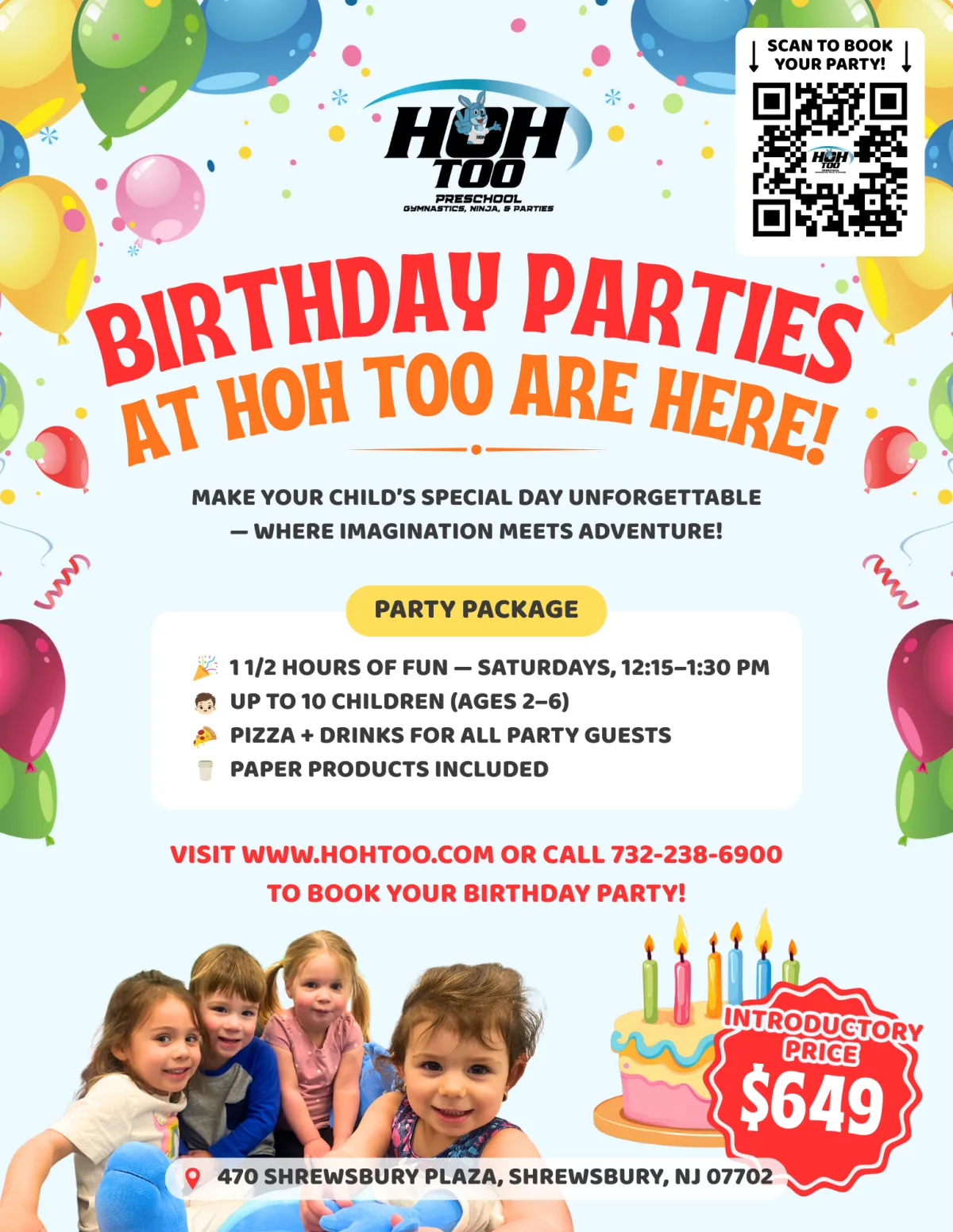 Please note: Birthday parties that are currently offered at our HOH Too–Shrewsbury location are available on Saturdays from 12:15 PM-1:30 PM. We can accommodate up to 10 children (ages 2–6). Pizza, drinks, and all paper products are included for your party guests. We look forward to celebrating with you!