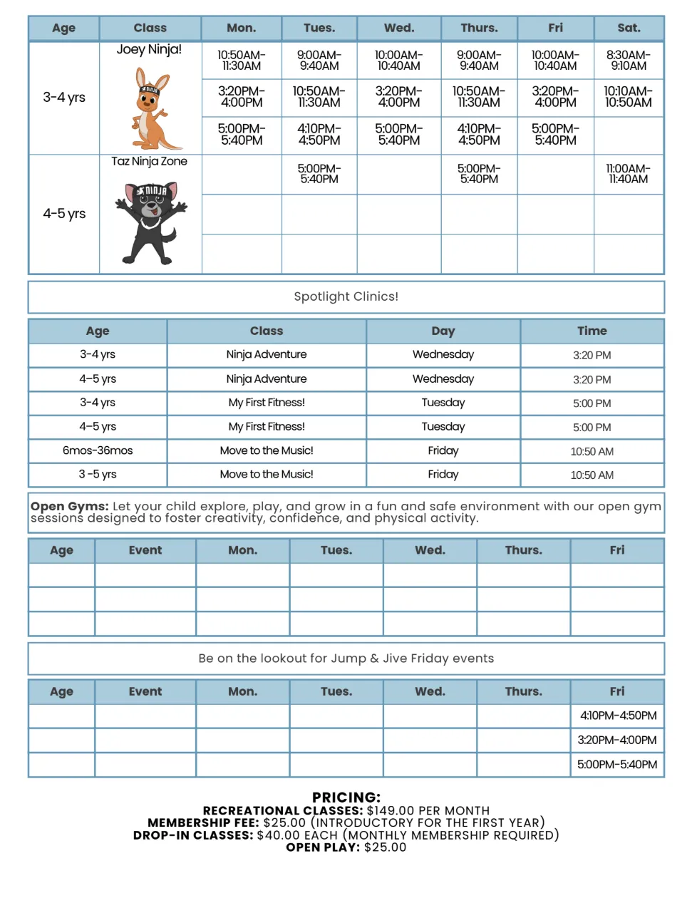Do you offer birthday parties? Yes! Our birthday parties include gymnastics, ninja activities, and plenty of fun for your child and guests.