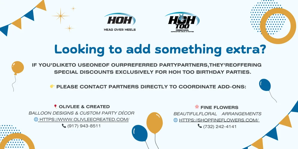 Please note: Birthday parties that are currently offered at our HOH Too–Shrewsbury location are available on Saturdays from 12:00 PM to 1:30 PM. We can accommodate up to 10 children (ages 2–6). Pizza, drinks, and all paper products are included for your party guests. We look forward to celebrating with you!
